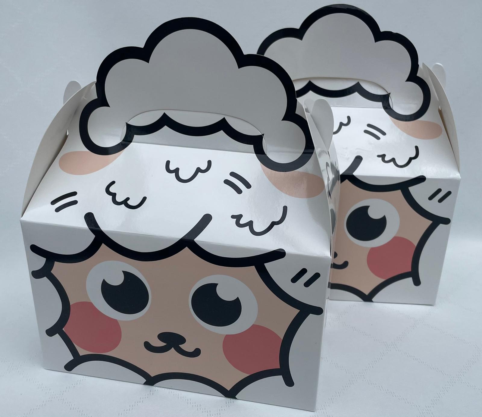 Een Eid al-Adha kids box gevuld met een bakje schepsnoep, cakje/koekje, lolly, pakje drinken en snoepstick.