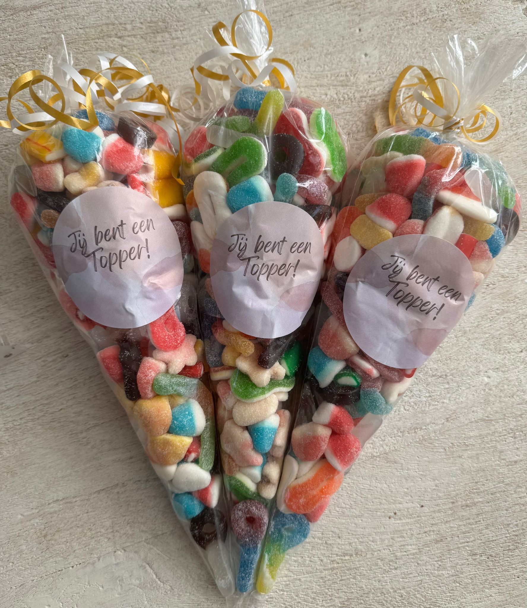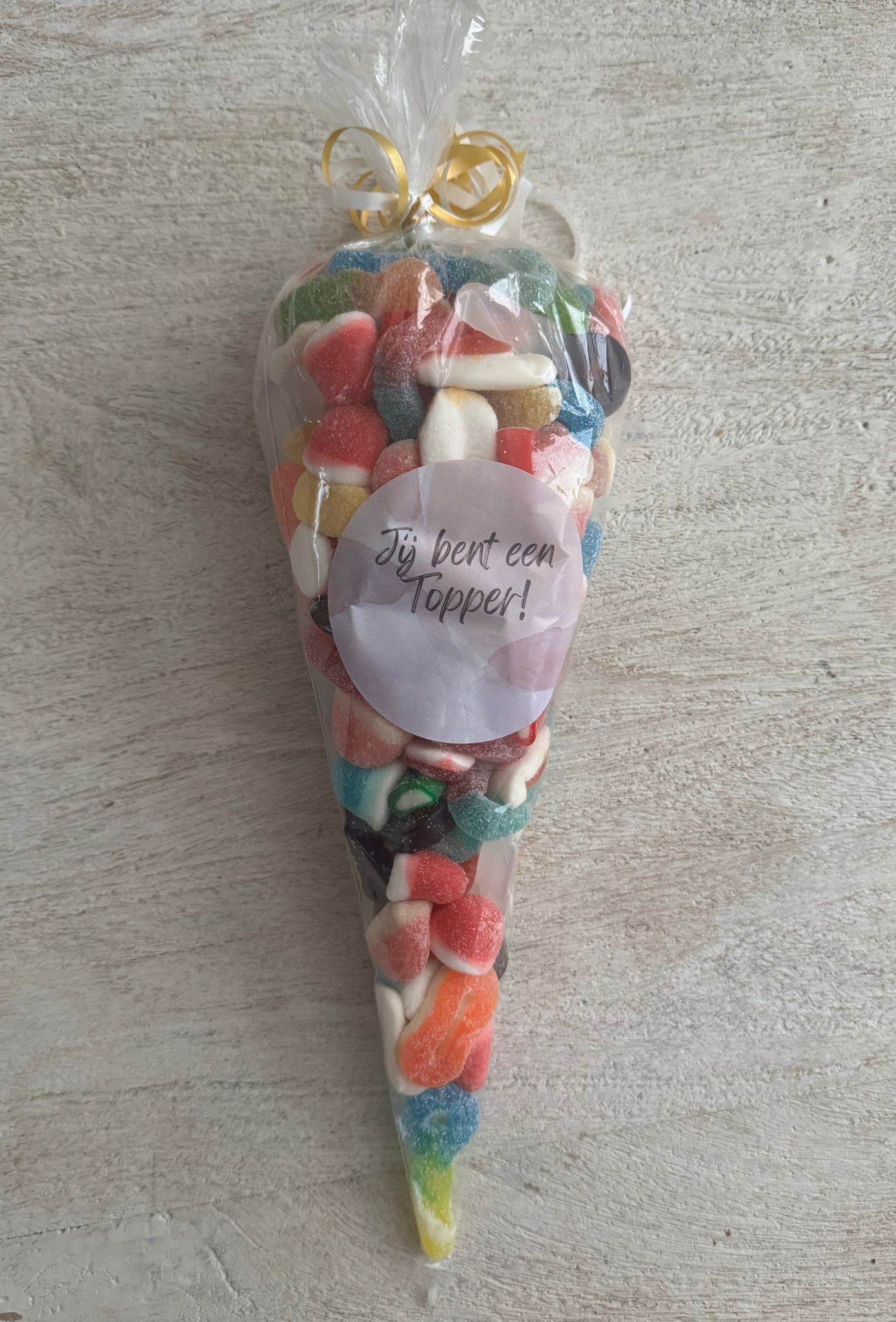 Een puntzak gevuld met een mix van zoete, zure en winegumsnoep.